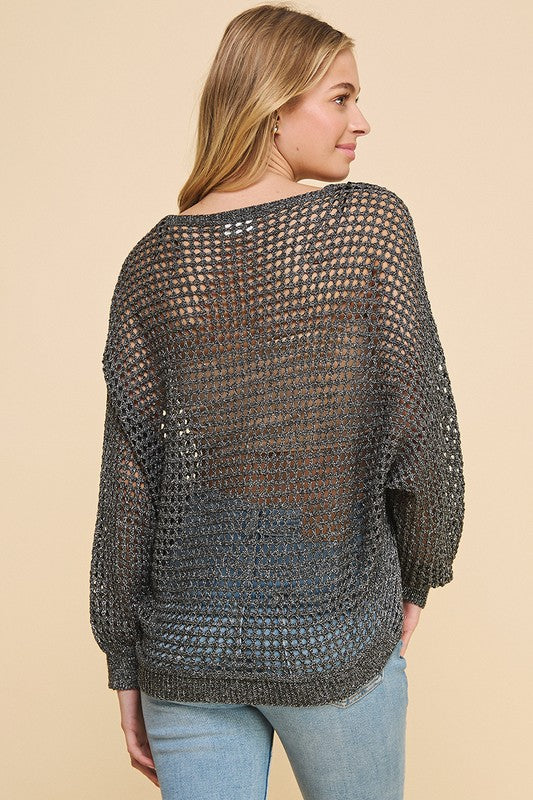 Long Sleeve Open Weave Foil Knit V-Neck Sweater,