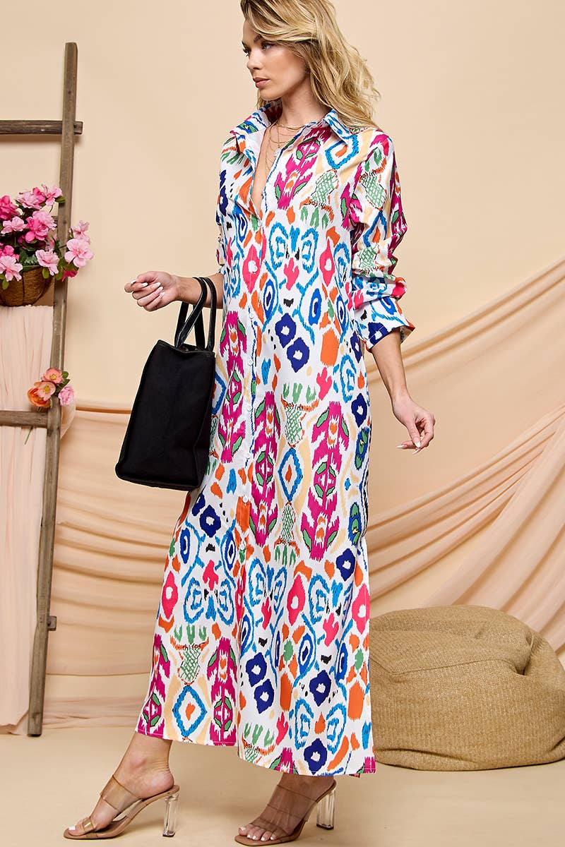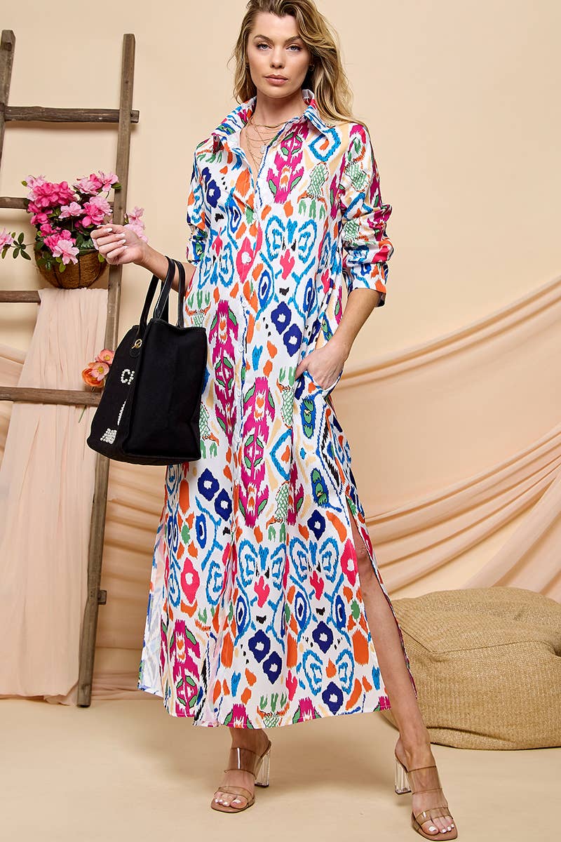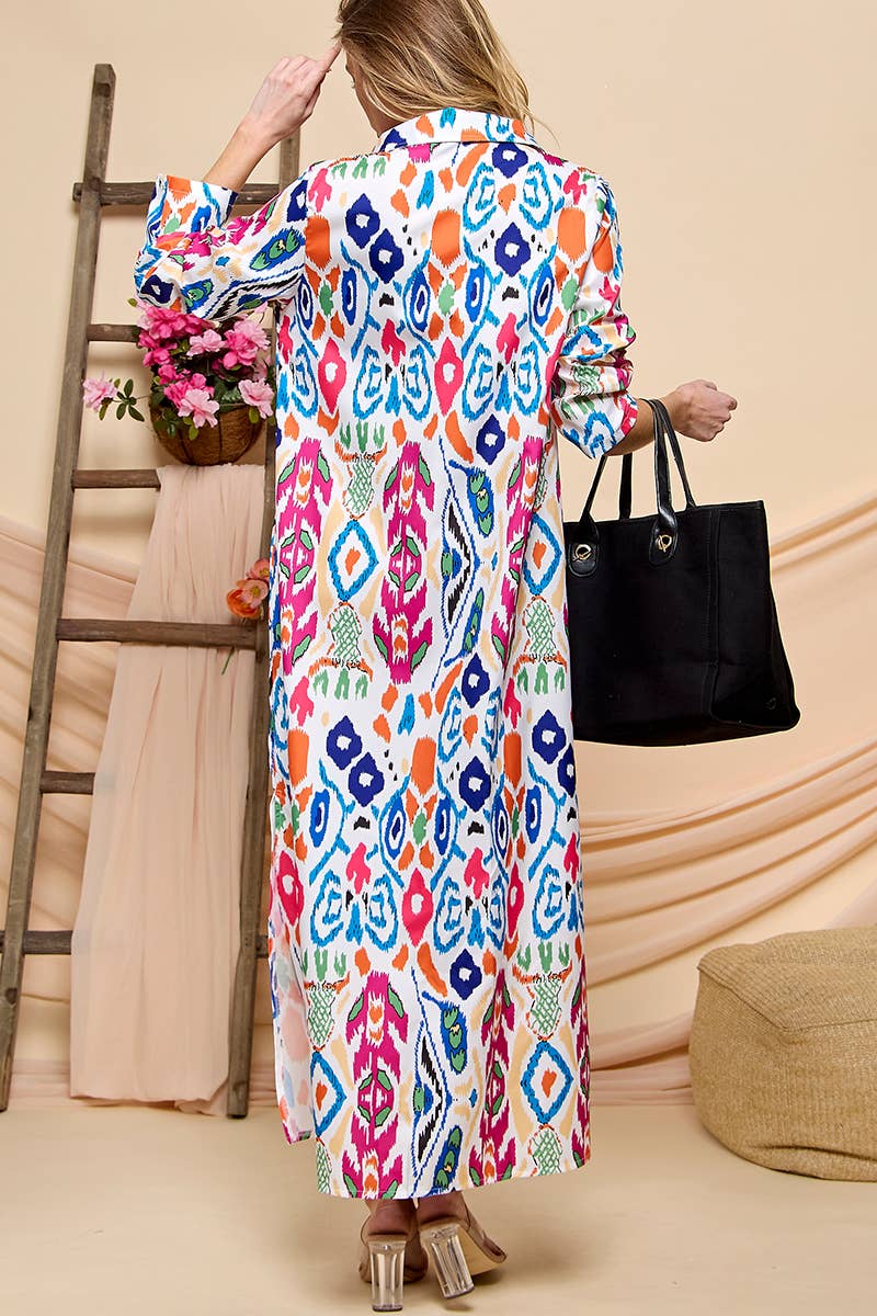 -Long Sleeve Print Shirt Dress -100% Polyester made in China Pockets and side slit
