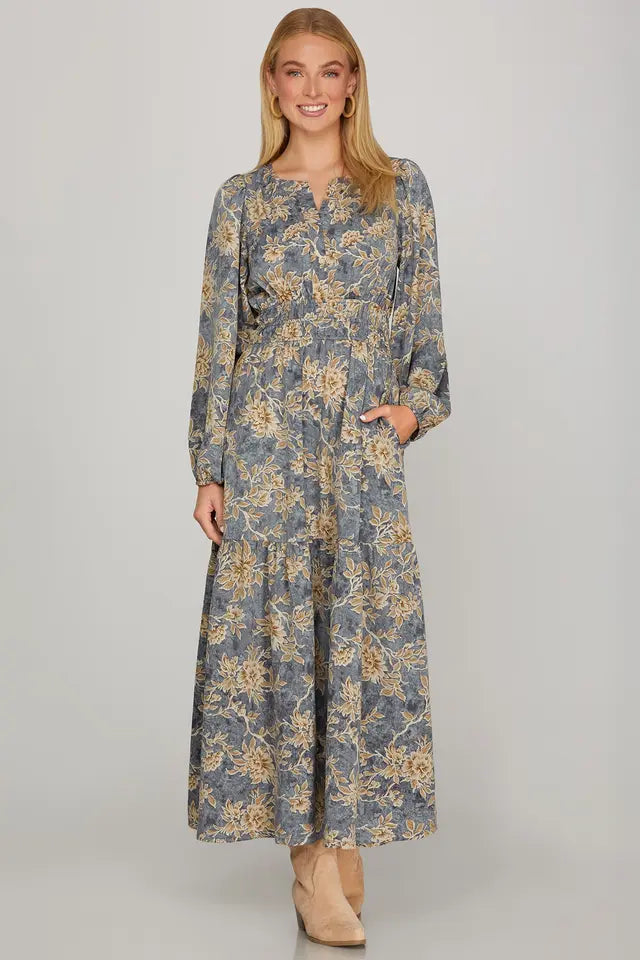 LONG SLEEVE WOVEN PRINT TIERED MAXI DRESS WITH ELASTIC WAISTBAND AND POCKETS