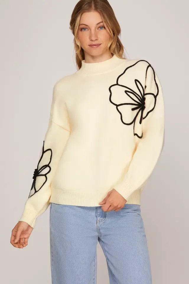 LONG SLEEVE SWEATER TOP WITH FLOWER EMBELLISHMENTS
