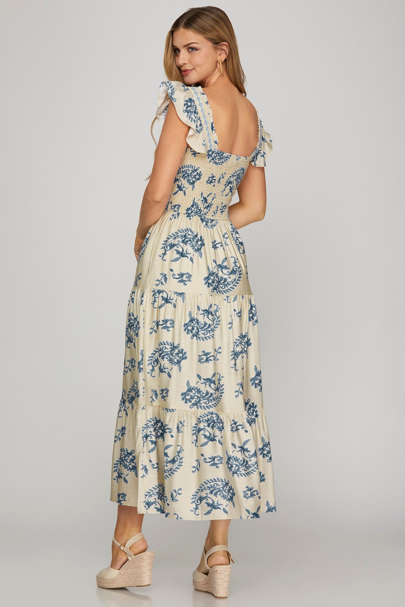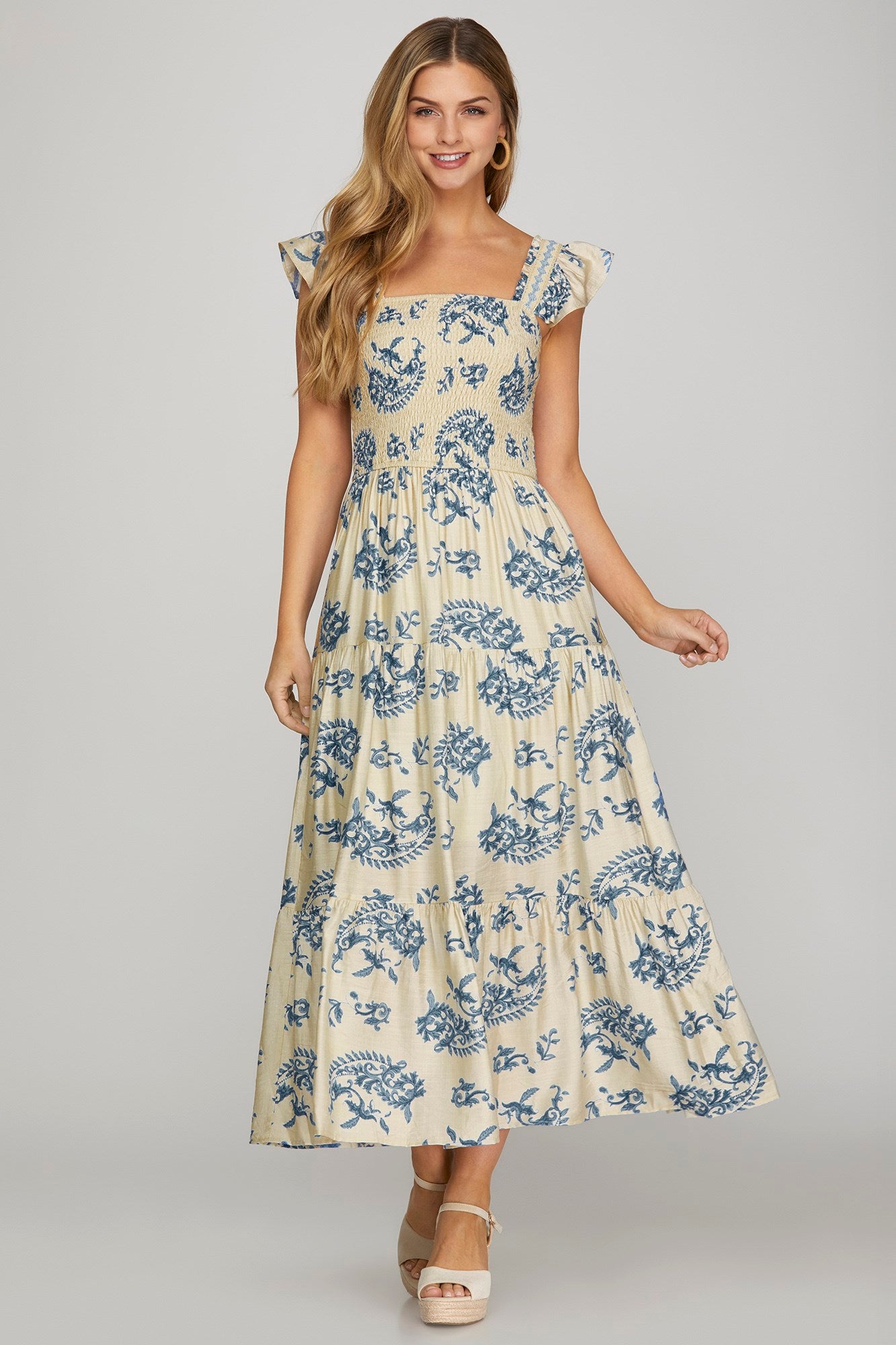 Ruffled Sleeve Square neck woven print smocked tiered maxi dress with trim. Tied shoulder strap and pockets model is wearing size small