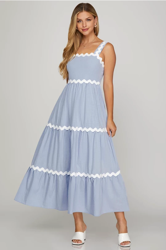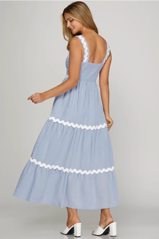 Contrast ric rac trim tiered woven midi dress with back smocking