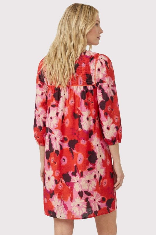 SMOCKED KEY HOLE TIE NECK, 3Q SLEEVE, FLORAL PRINTED SHIFT DRESS WITH POCKETS