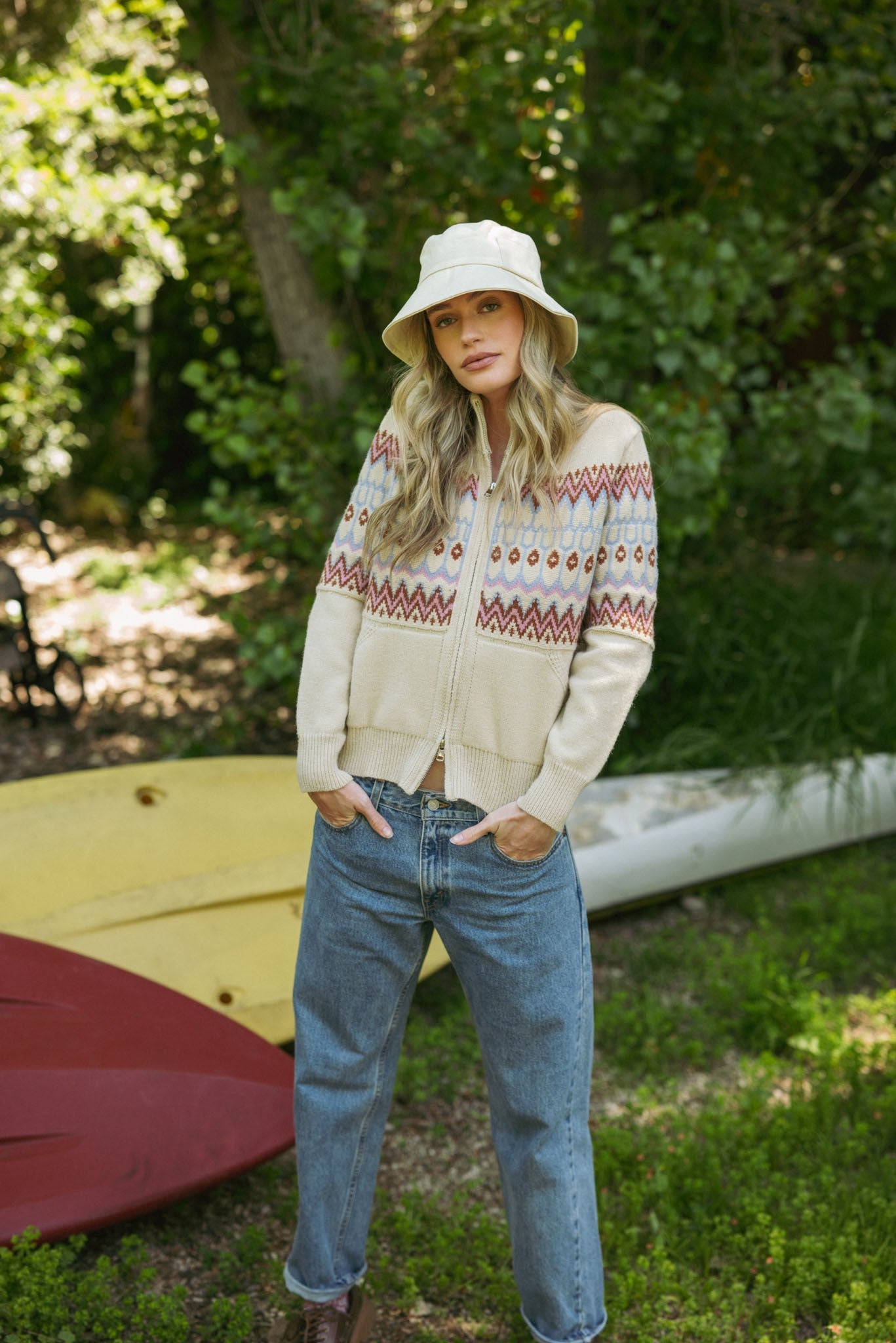 + Fair isle zip up sweater cardigan + Ribbed stand collar + Double slide zipper closure + Long sleeves with ribbed knit cuff + Front pockets + Model is 5' 10.5" 32-24-36 and wears a S