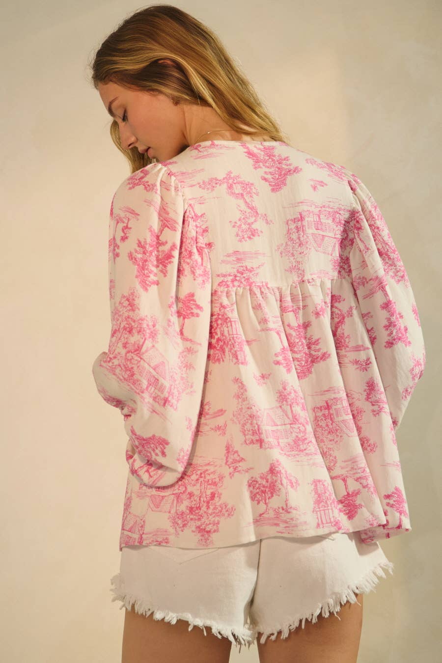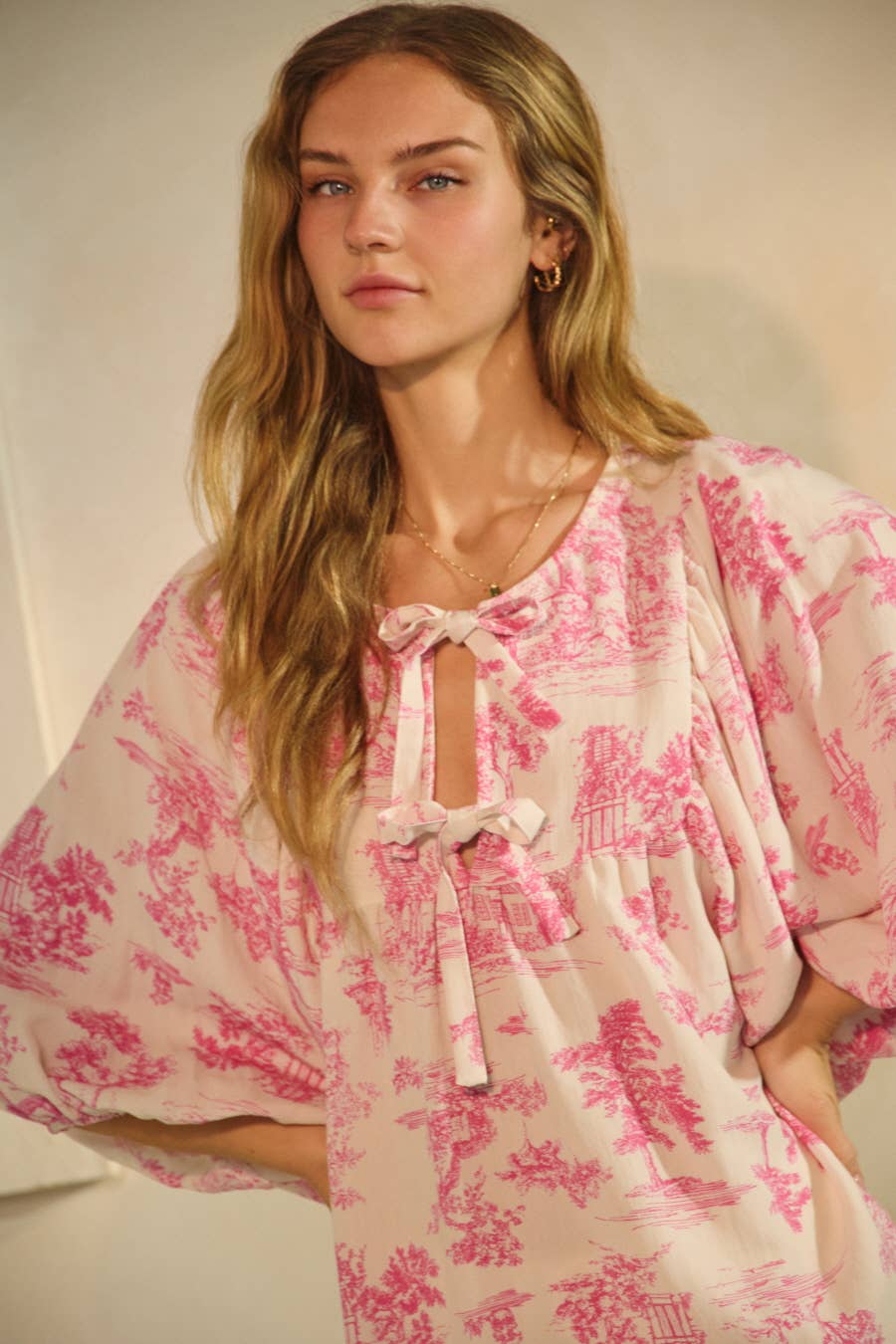 Toi de Paris printed blouse featuring batwing sleeve and front tie details.